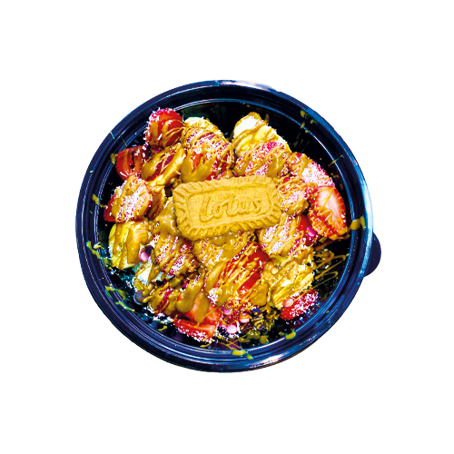 Dilimlenmiş Çıtır Wafflecım Hamuru Muz, Çilek, Yer Fıstık, Damla Çikolata Sütlü Belçika Çikolata ve Karamel Sos İle Birlikte Kasede Servis Edilir
