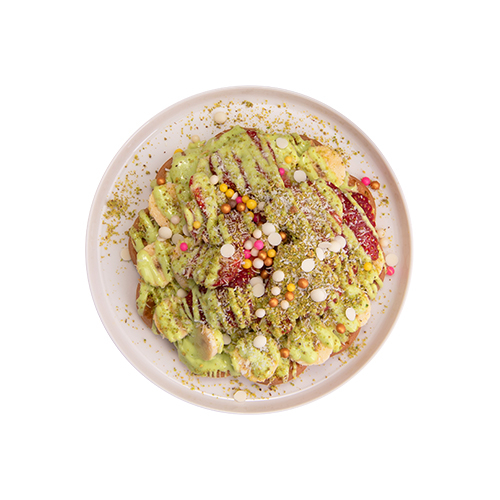 Brüksel Waffle Hamuru Üzerine Antep Fıstığı Ezmesi, Muz, Çilek, Yer Fıstık, Sütlü Belçika Çikolatası ve Antep Fıstığı Ezmesi