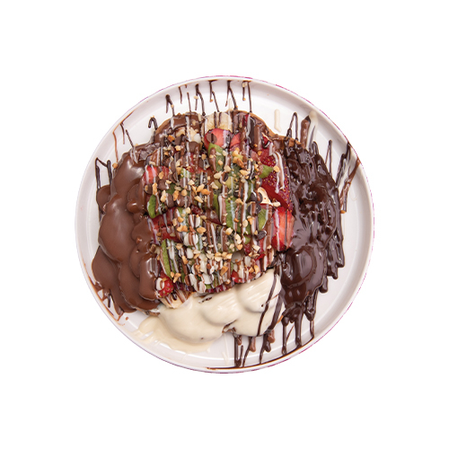 Brüksel Waffle Hamuru Üzerine Bitter Belçika Çikolatası ve Beyaz Belçika Çikolatası, Muz, Çilek, Yer Fıstığı