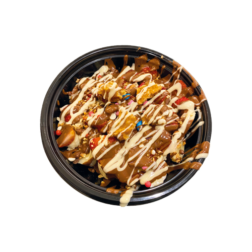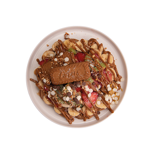 Dilimlenmiş Çıtır Wafflecım Hamuru Muz, Çilek, Yer Fıstık, Damla Çikolata Sütlü Belçika Çikolata ve Karamel Sos İle Birlikte Kasede Servis Edilir