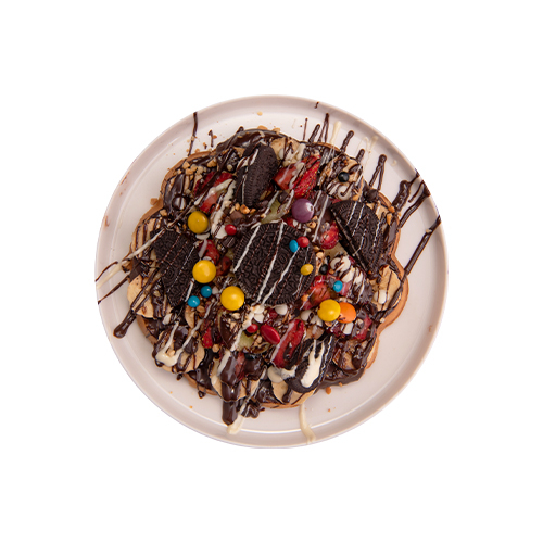 Çıtır Wafflecım Hamuru Üzerine Nutella, Muz, Çilek, Yer Fıstığı, Damla Çikolata ve Oreo Parçaları, Sütlü Çikolata